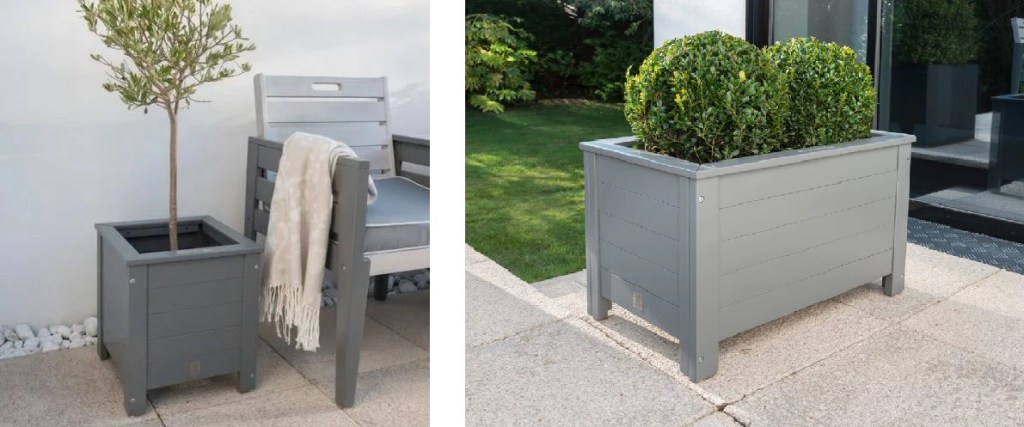 With a contemporary grey finish and a width of up to 59cm, these planters have an approximate capacity of 40 litres and come with two removable plastic liners.